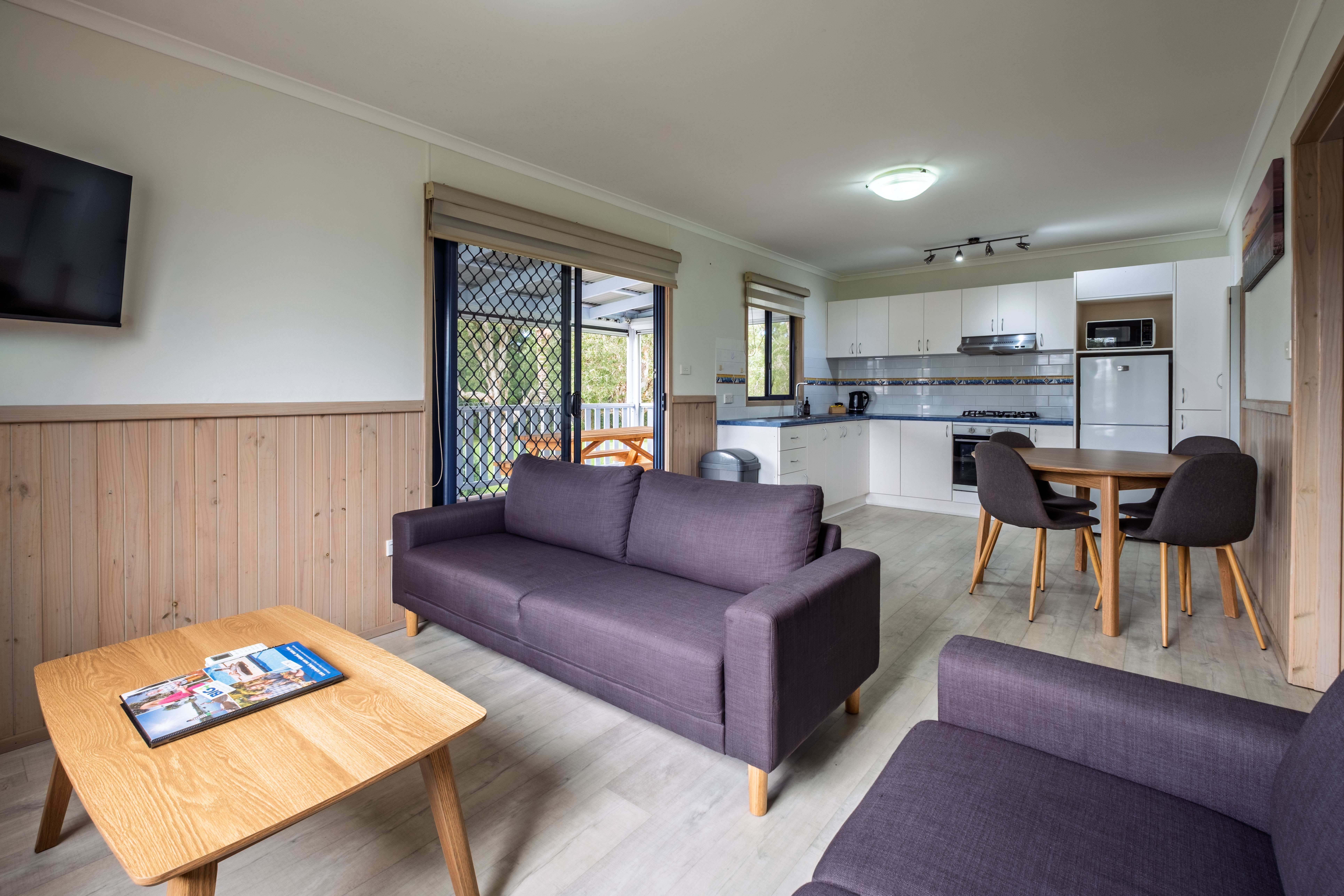 With 1 x king bed & 1 x bunk bed, the cabin is fully self-sufficient, with everything you need for the perfect getaway, including a large deck for outdoor dining.