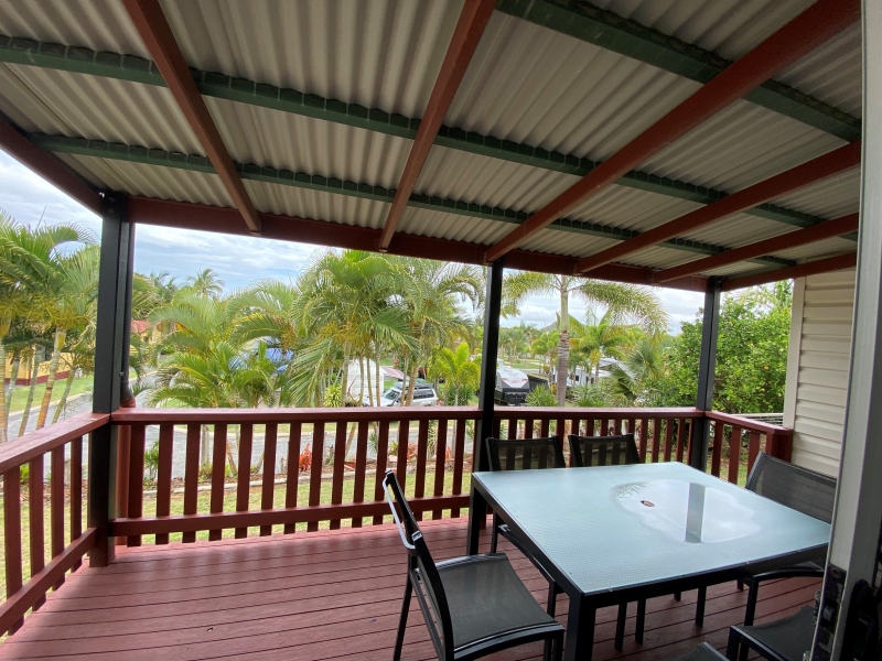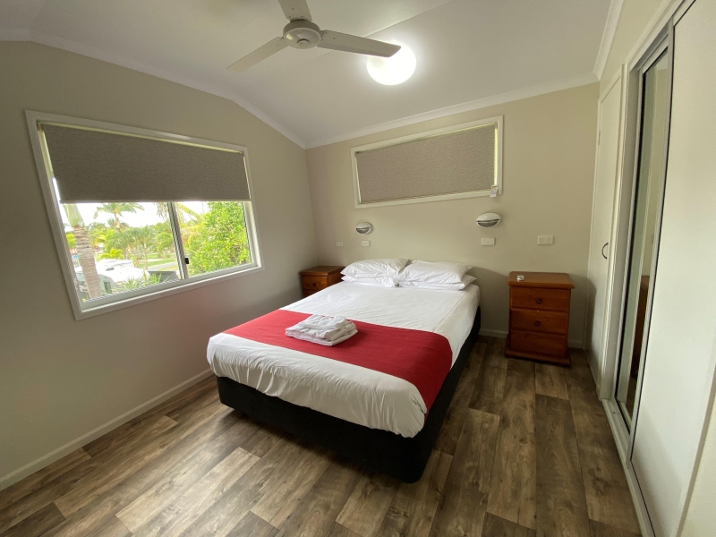Located in a quiet area overlooking the park, 2 bedroom cottage sleeps six. One queen bed and two single bunks. Featuring air conditioning; bathroom; full kitchen with oven, microwave, fridge and hotplates; dining area; lounge with TV and DVD; small shaded veranda; undercover parking for one vehicle.