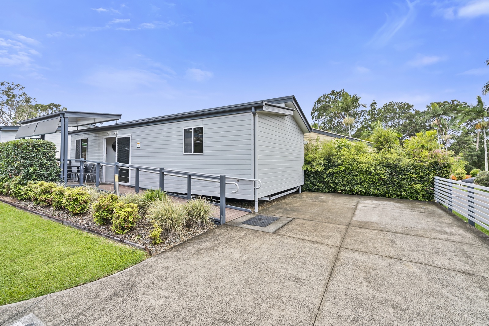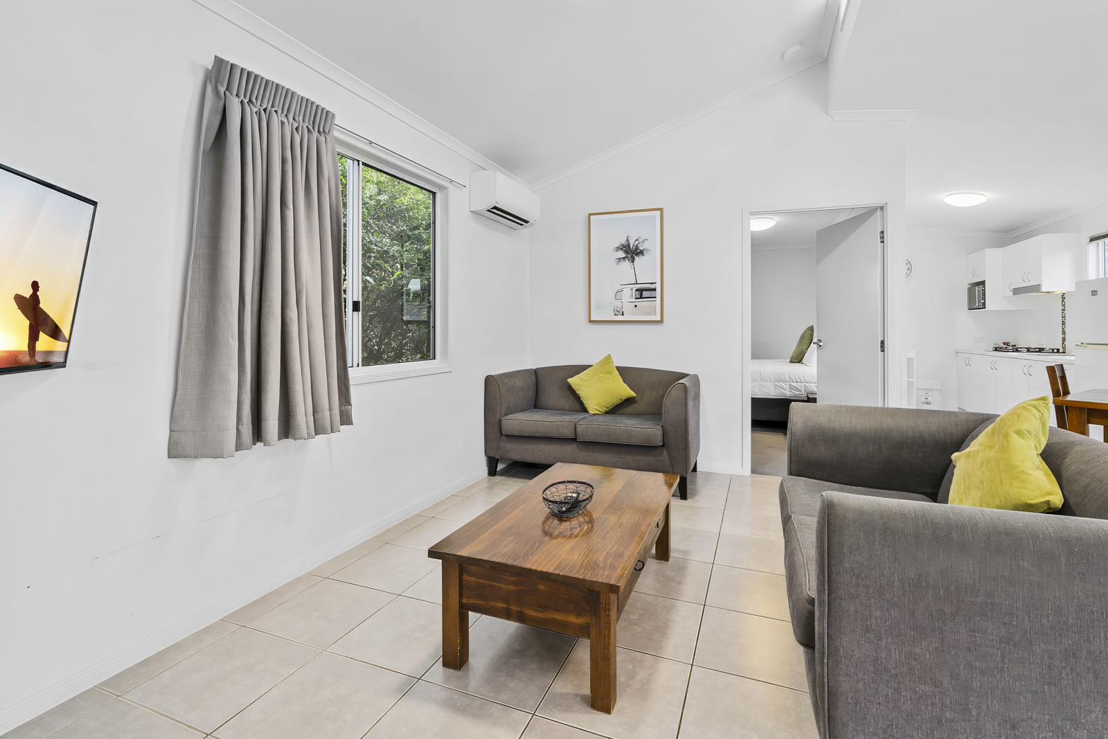 Stay in accessible comfort. Our Two Bedroom Villa sleeps up to four guests with a queen bed in the main bedroom and a double bed in the second bedroom, as well as an accessible bathroom, kitchen, living area, and private deck with ramp entry.