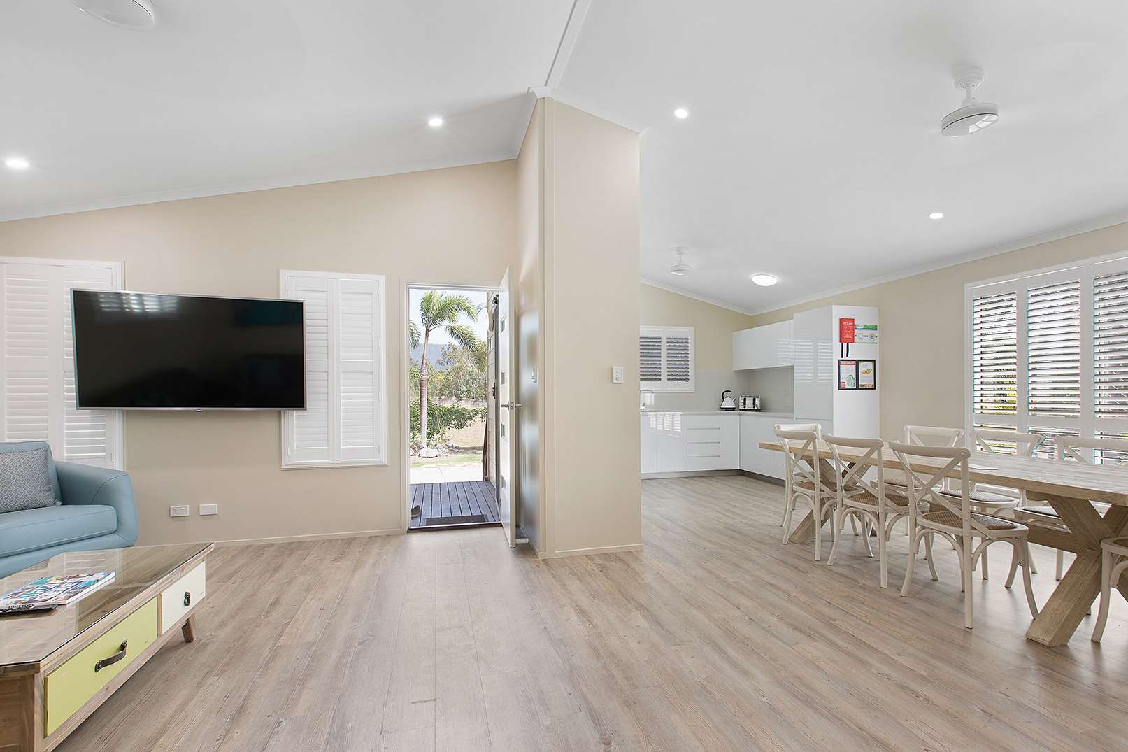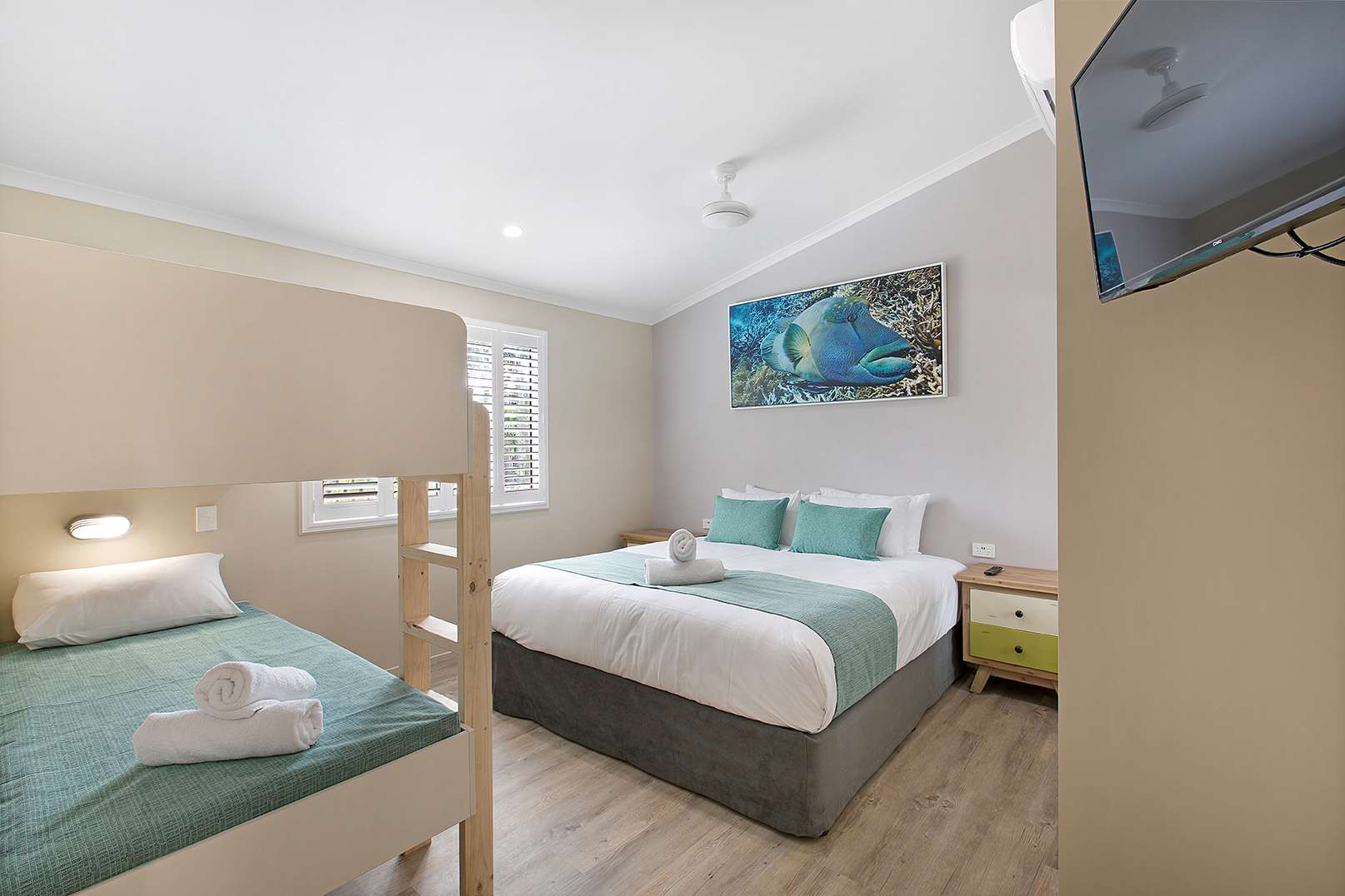 Our Premium 2 Bedroom Cottages are the ultimate modern 2 bedroom cabin and simply stunning! With a relaxing location that overlooking Paluma Range and in close proximity to our waterslide park, resort pool, playground and jumping pillow you’ll find yourself sitting back on the huge balcony truly relaxed while you watch the kids run free! With two-bedrooms, one bathroom, separate toilet and an enormous living area our cottages are ideal for a large family or a group of eight travelling together with their clever bedding configuration. The two bedrooms both have a king bed and a set of bunk beds. Full kitchen with a oven and dishwasher, washing machine and dryer. A minimum night stay applies depending upon the season.