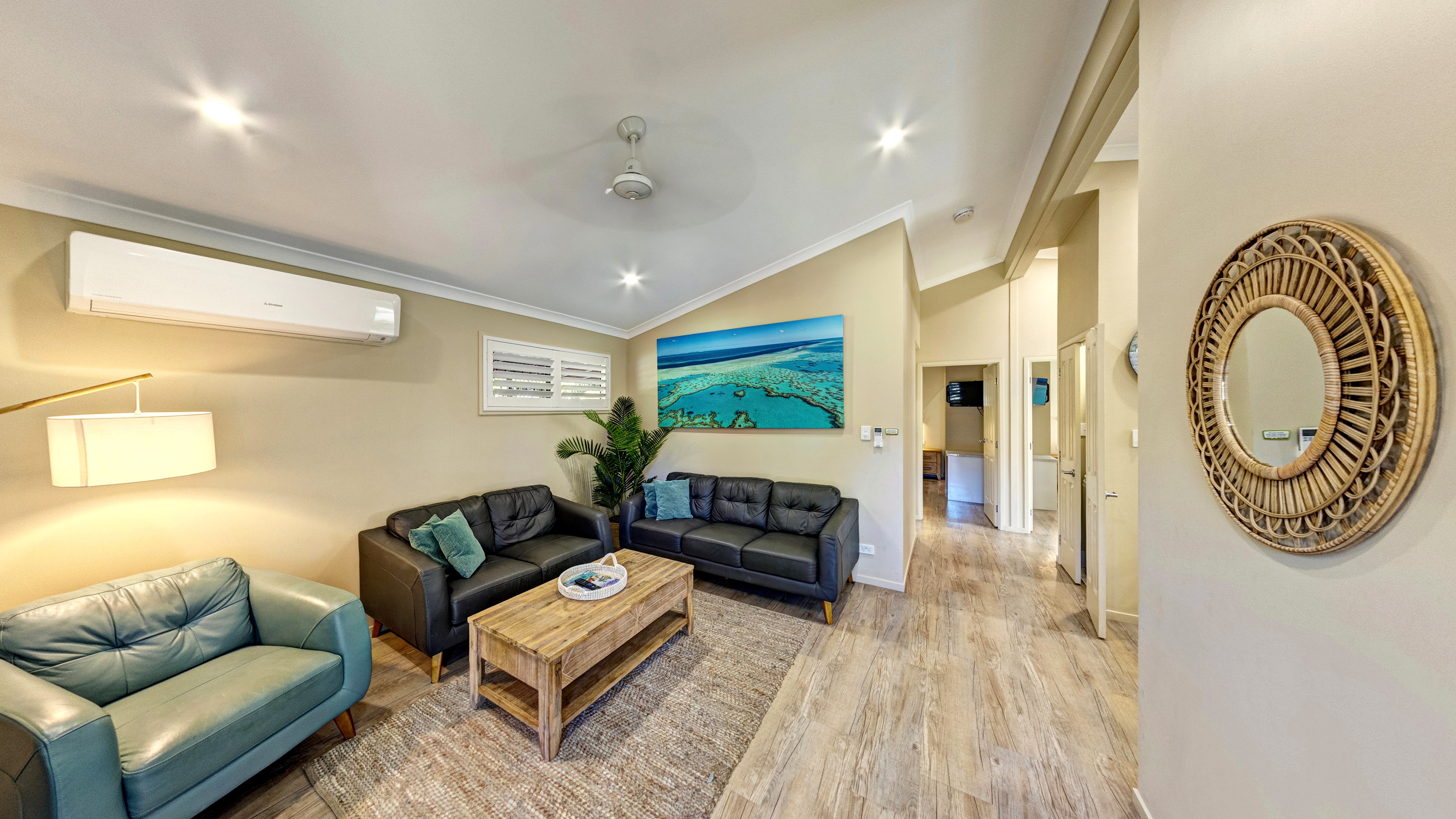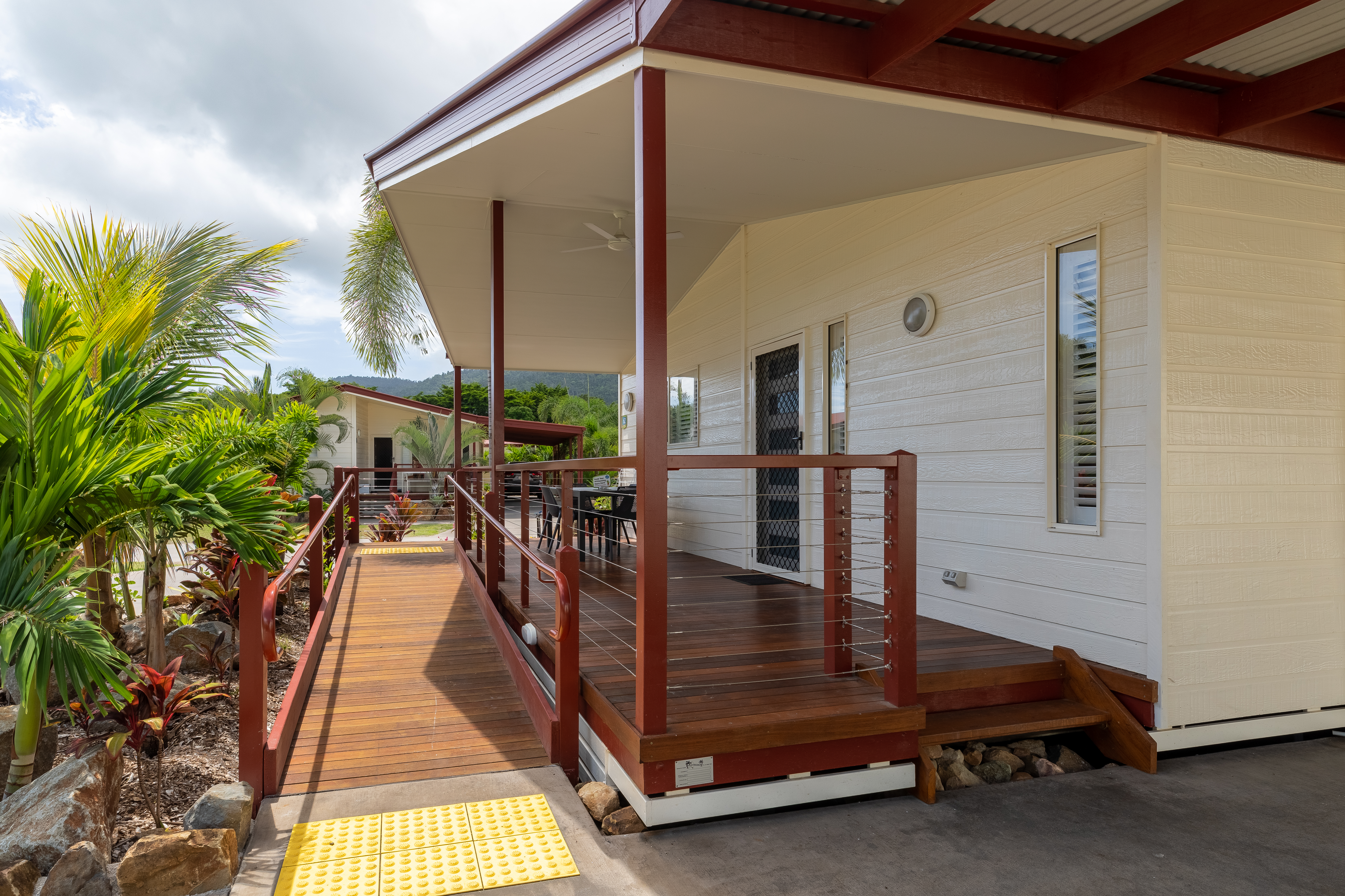 Our Premium 2 Bedroom Cottage Deluxe Accessibles are our largest accessible style of accommodation and the ultimate modern 2 bedroom cabin and simply stunning! With a relaxing location that overlooking the animal park and Paluma Range and in close proximity to our waterslide park, resort pool, playground and jumping pillow, you’ll find yourself sitting back on the huge balcony truly relaxed while you watch the kids run free! With two-bedrooms, two bathrooms (one wheelchair accessible), separate toilet and an enormous living area our cottages are ideal for a large family or a group of six travelling together. One bedroom has a king bed and a set of bunk beds, whilst the bedroom has a king bed and is wheelchair accessible. Full kitchen with an oven and dishwasher, washing machine and dryer. A minimum night stay applies depending upon the season.