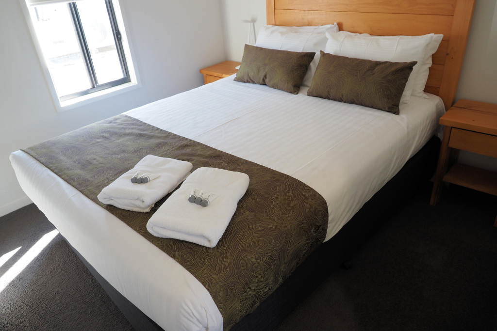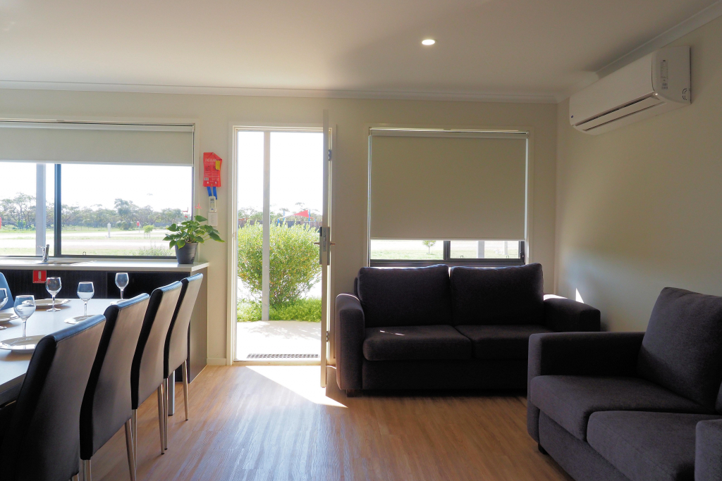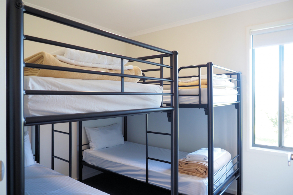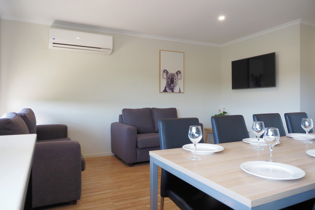Deluxe 3 Bedroom Villas each feature a main bedroom with king bed, 2nd bedroom with a queen bed, 3rd bedroom with 2 x bunk beds. Fully equipped kitchen, open-plan lounge/dining, bathroom, air-conditioning, TV, and private driveway parking beside the cabin for one vehicle. All linen supplied. Recommended for sleeping up to 8 guests.