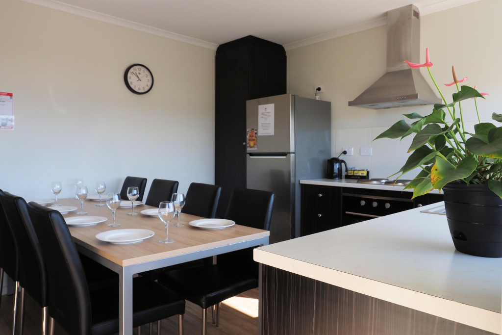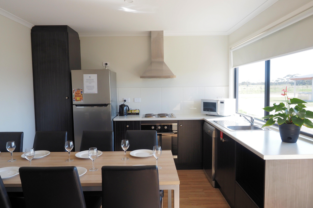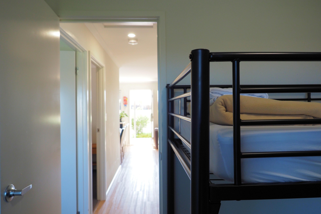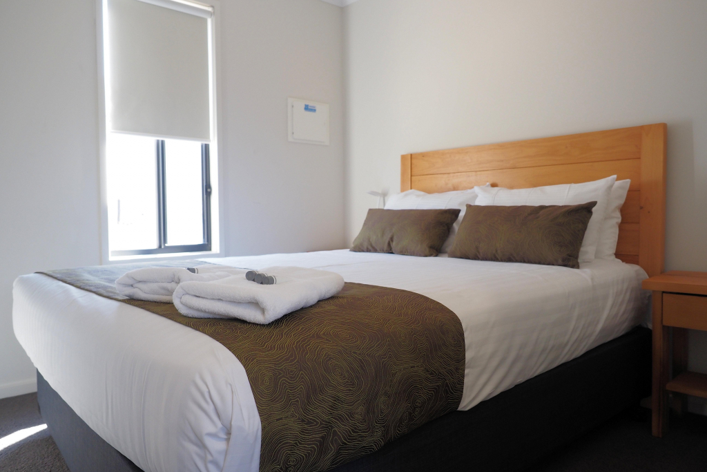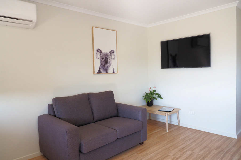 Deluxe 3 Bedroom Villas each feature a main bedroom with king bed, 2nd bedroom with a queen bed, 3rd bedroom with 2 x bunk beds. Fully equipped kitchen, open-plan lounge/dining, bathroom, air-conditioning, TV, and private driveway parking beside the cabin for one vehicle. All linen supplied. Recommended for sleeping up to 8 guests.