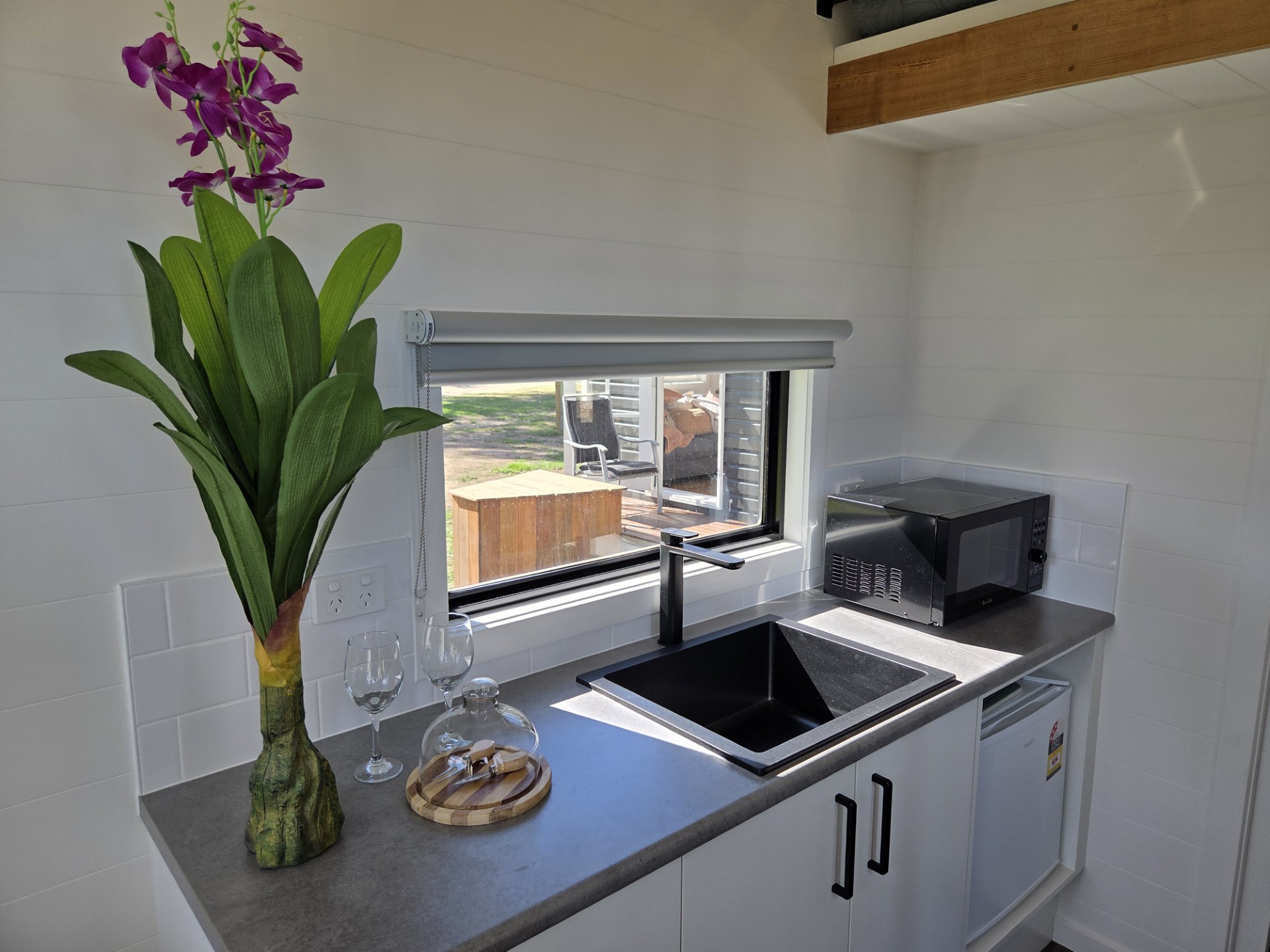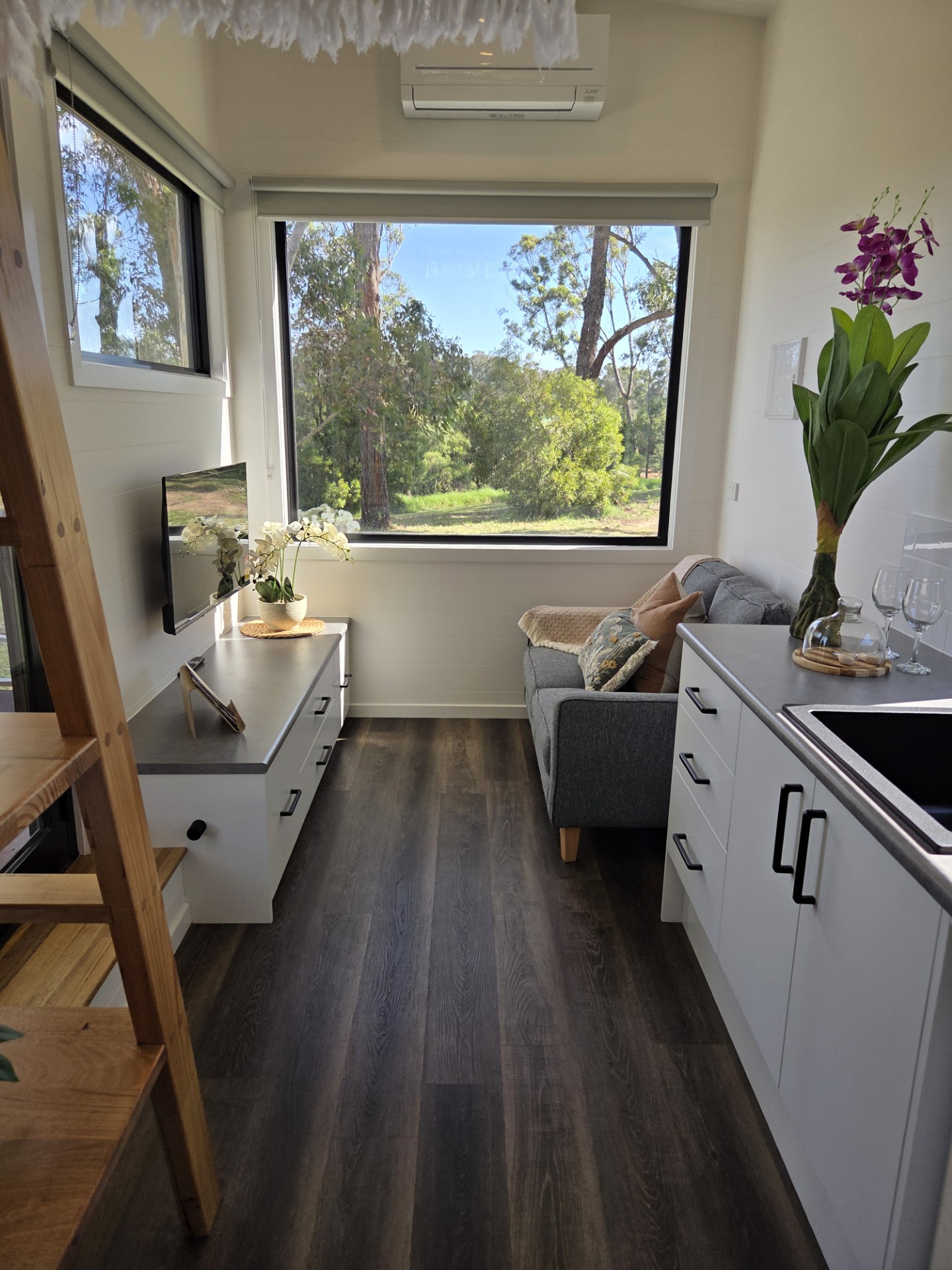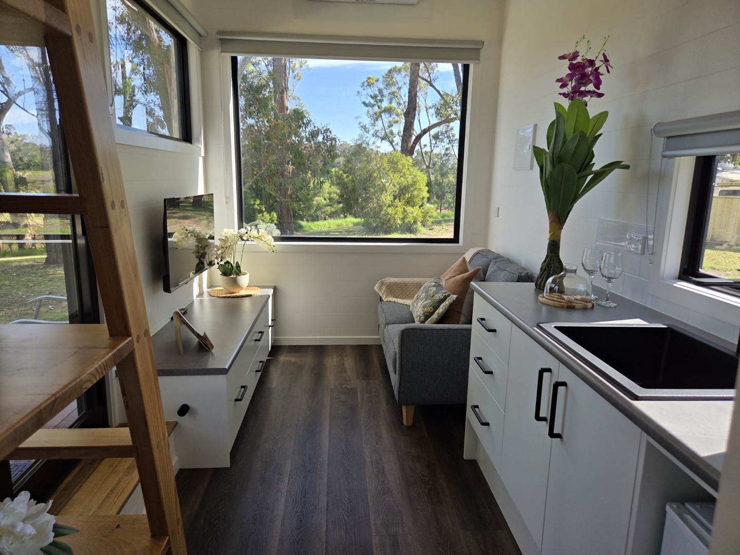 Our Numbat Tiny Home is fully self-contained. It features a Loft style double bed second level accessed via ladder and a private ensuite bathroom. Small kitchenette with coffee-making amenities. A TV and couch are provided. All Linen and towels provided.