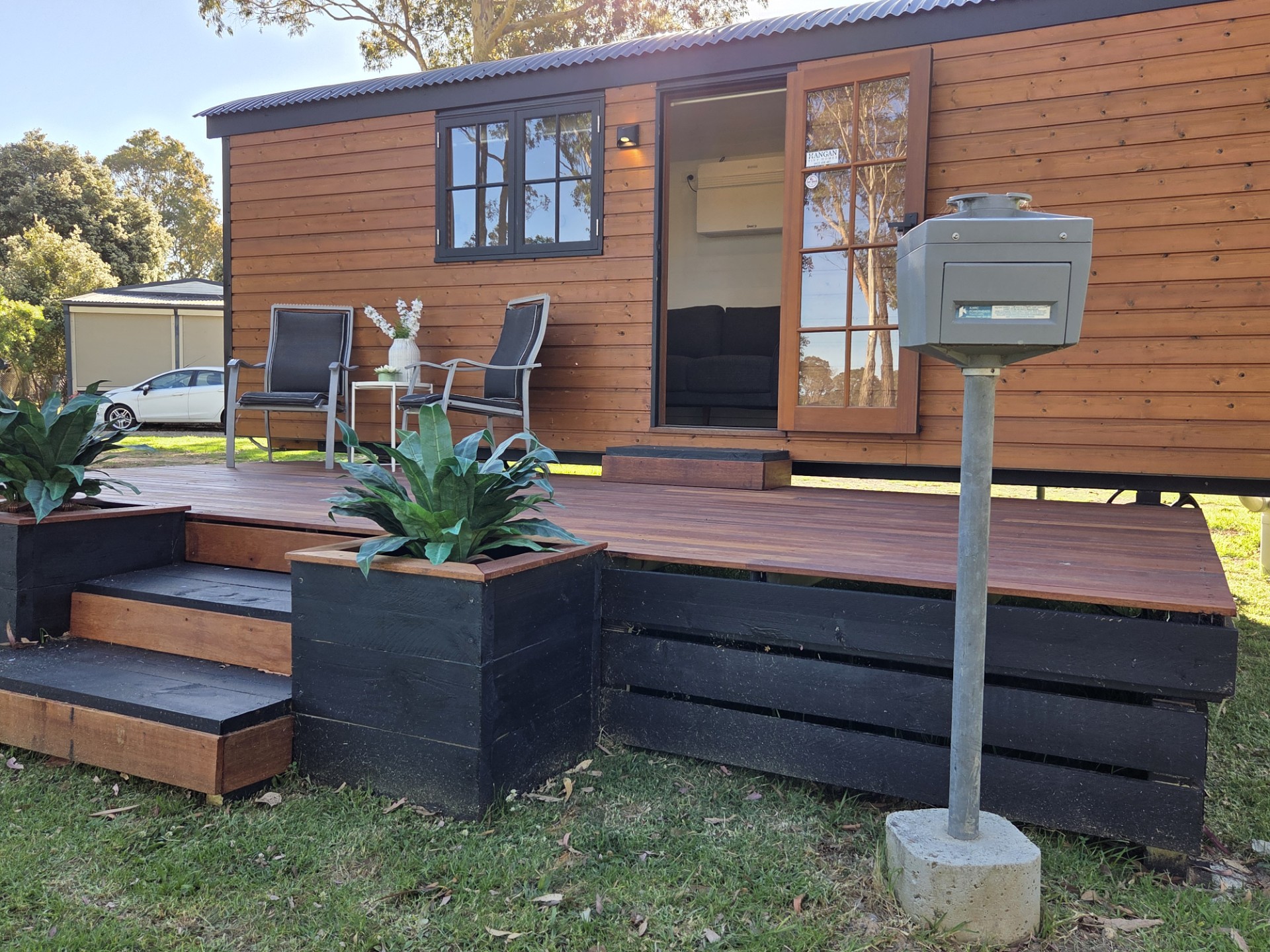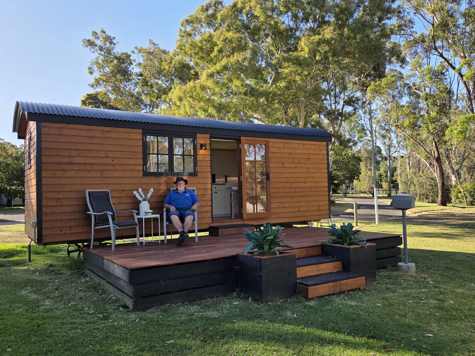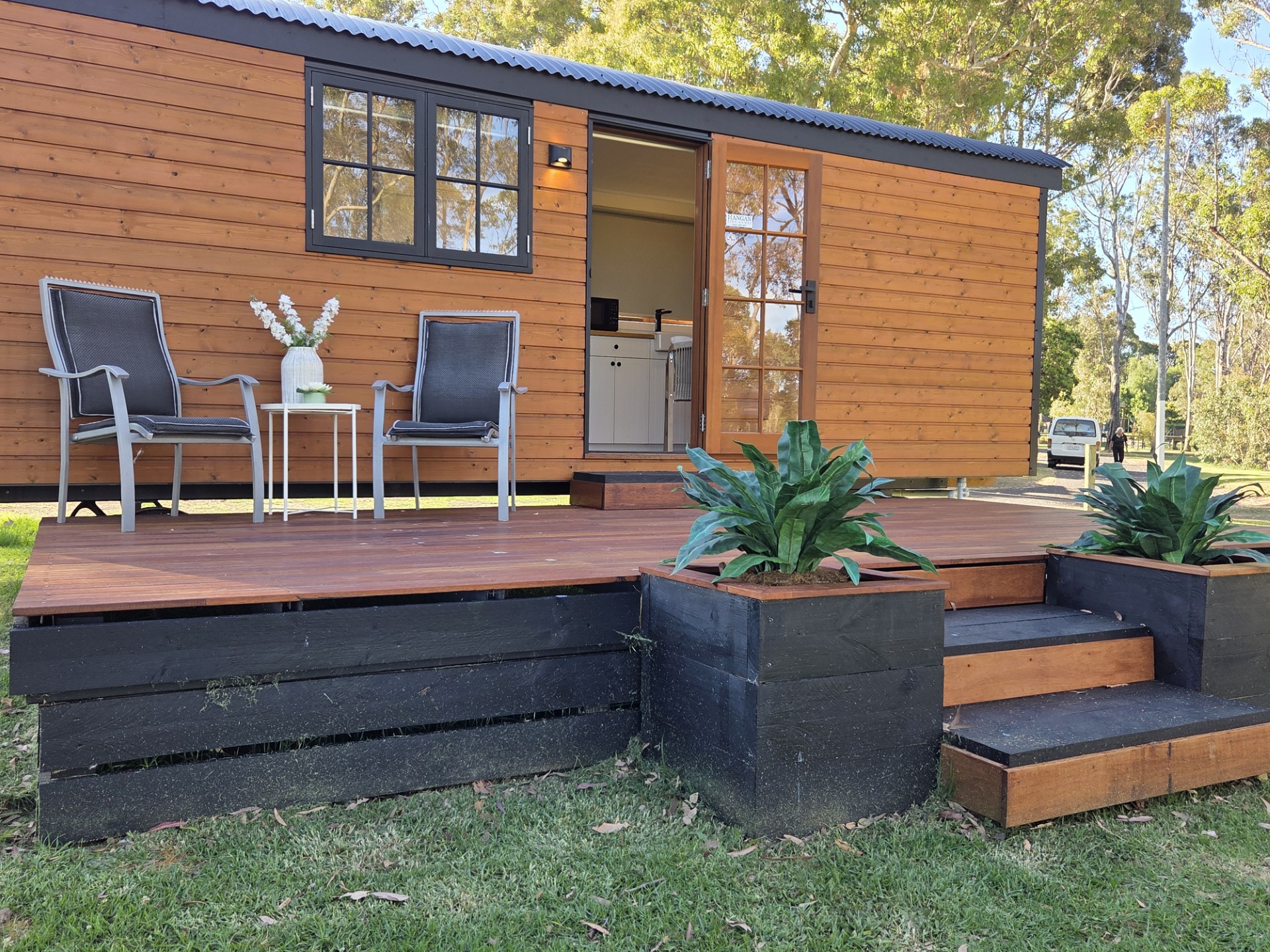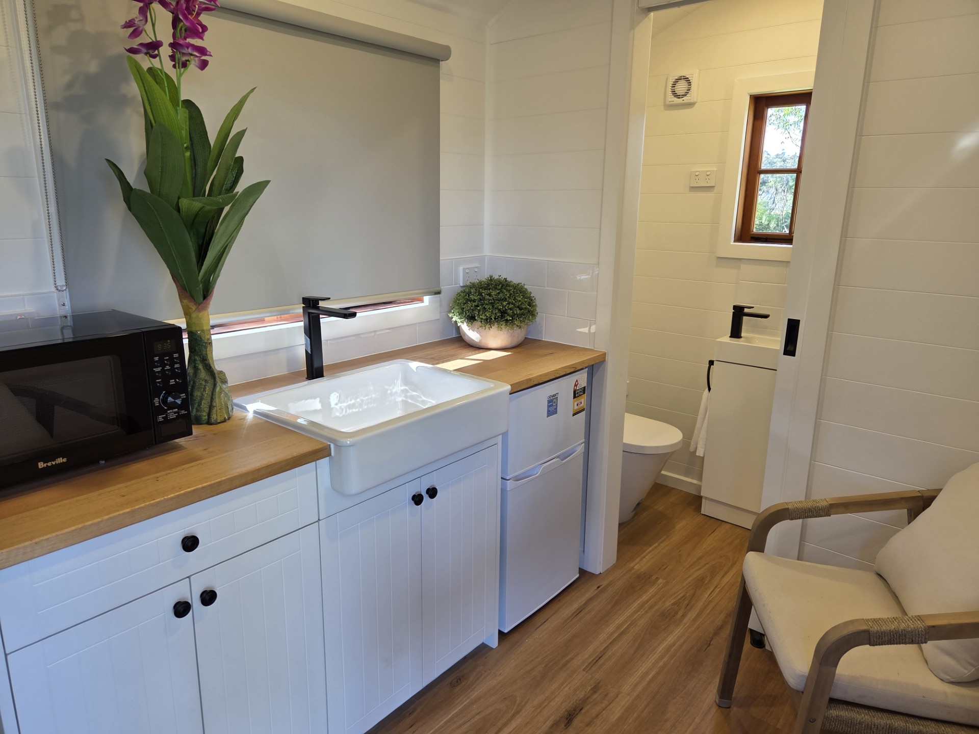 Our Wallaby Tiny Home is fully self-contained. It features a queen bed on the ground level and a private ensuite bathroom. Small kitchenette with coffee-making amenities. A TV is provided, however there is no couch. All linen and towels provided.