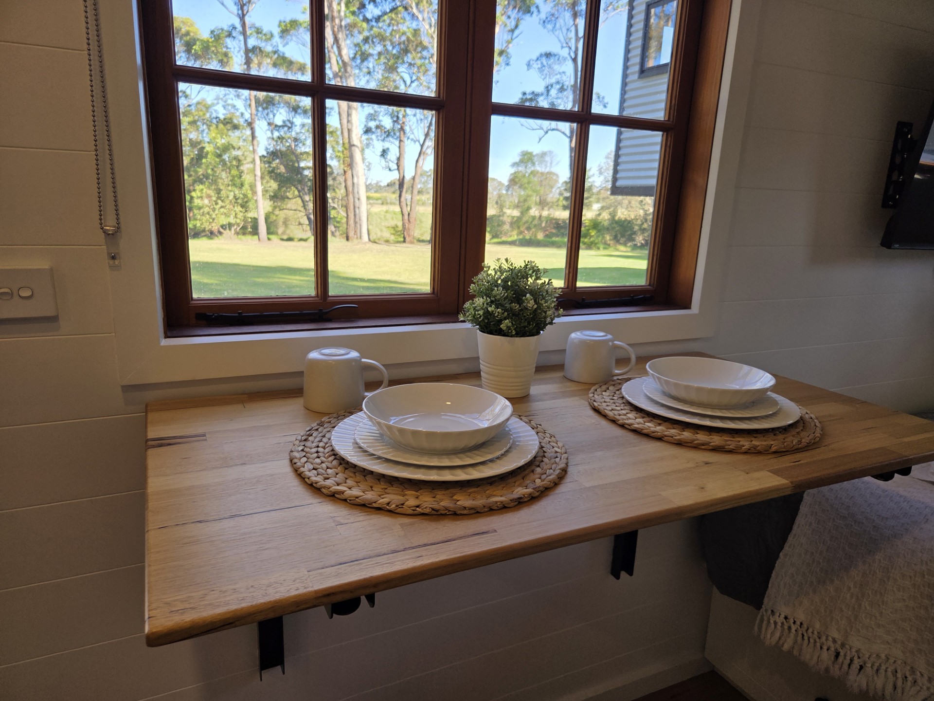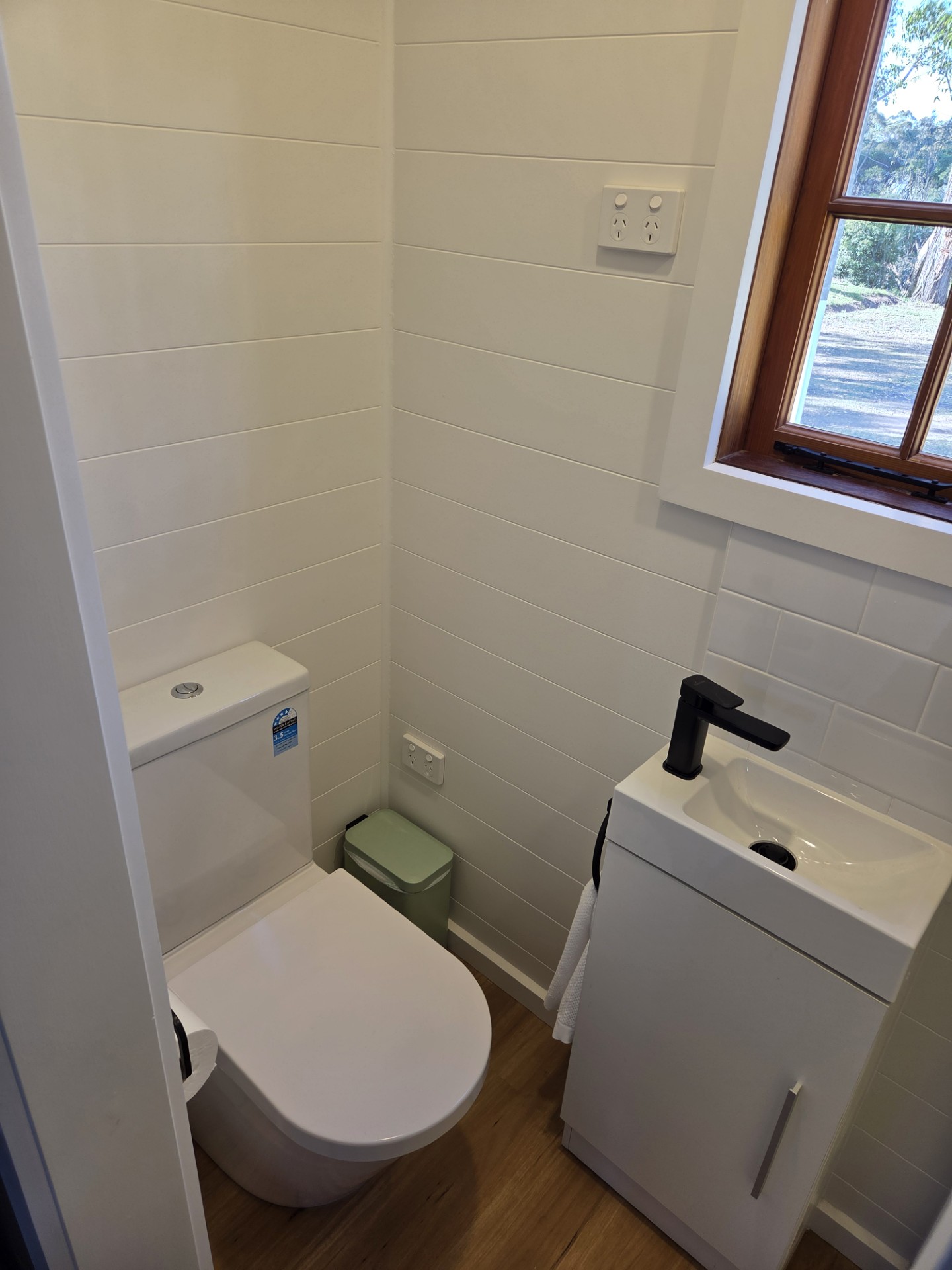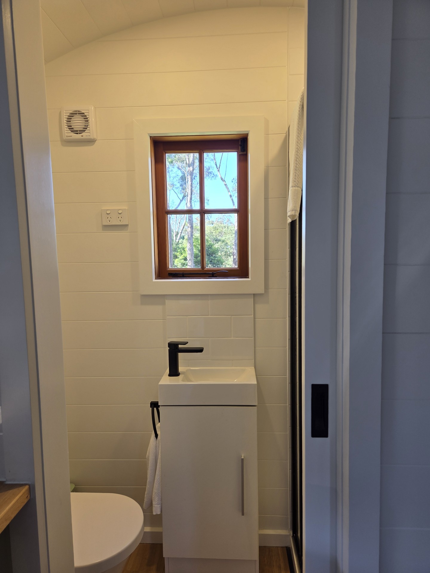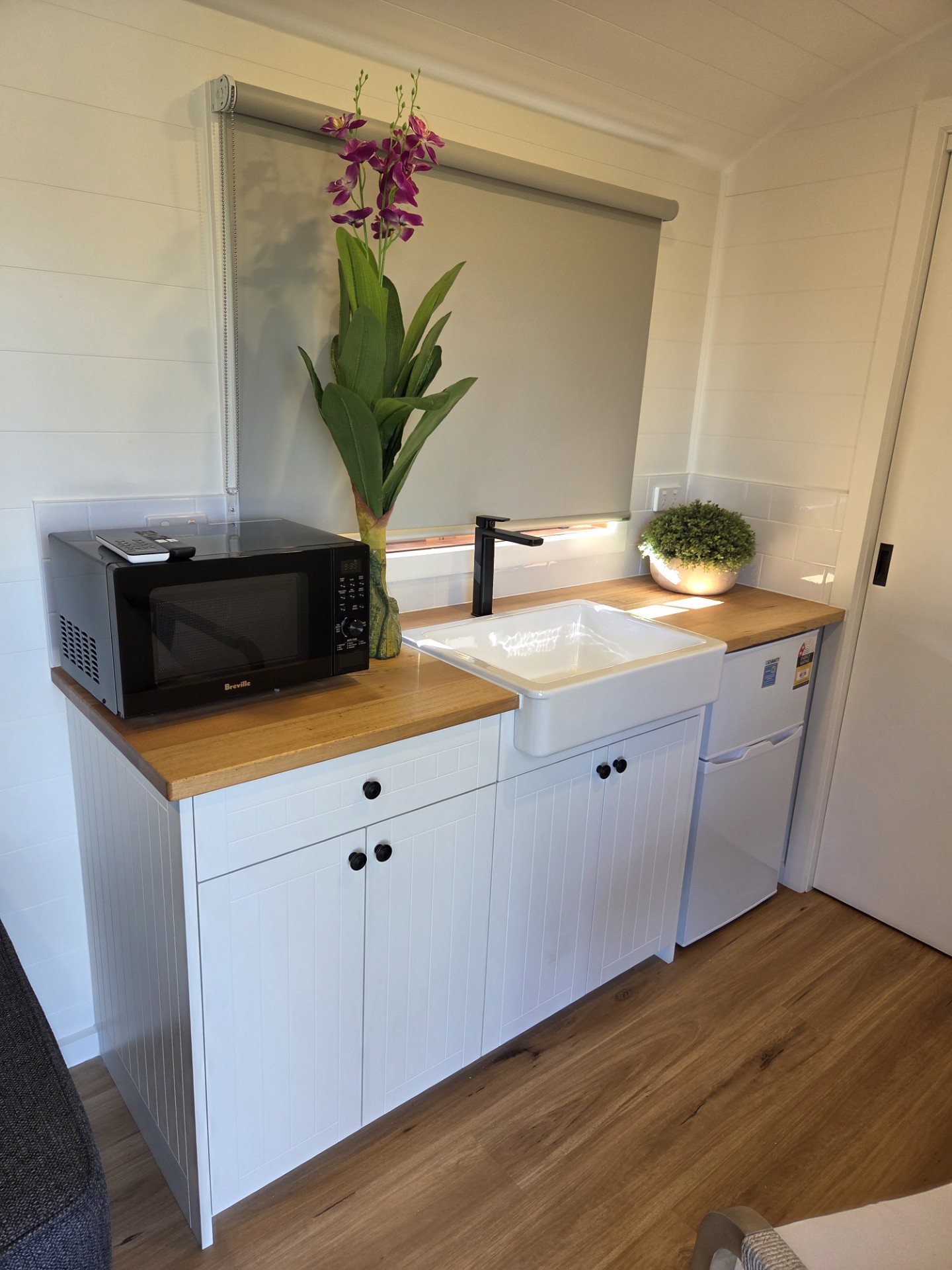 Our Wallaby Tiny Home is fully self-contained. It features a queen bed on the ground level and a private ensuite bathroom. Small kitchenette with coffee-making amenities. A TV is provided, however there is no couch. All linen and towels provided.