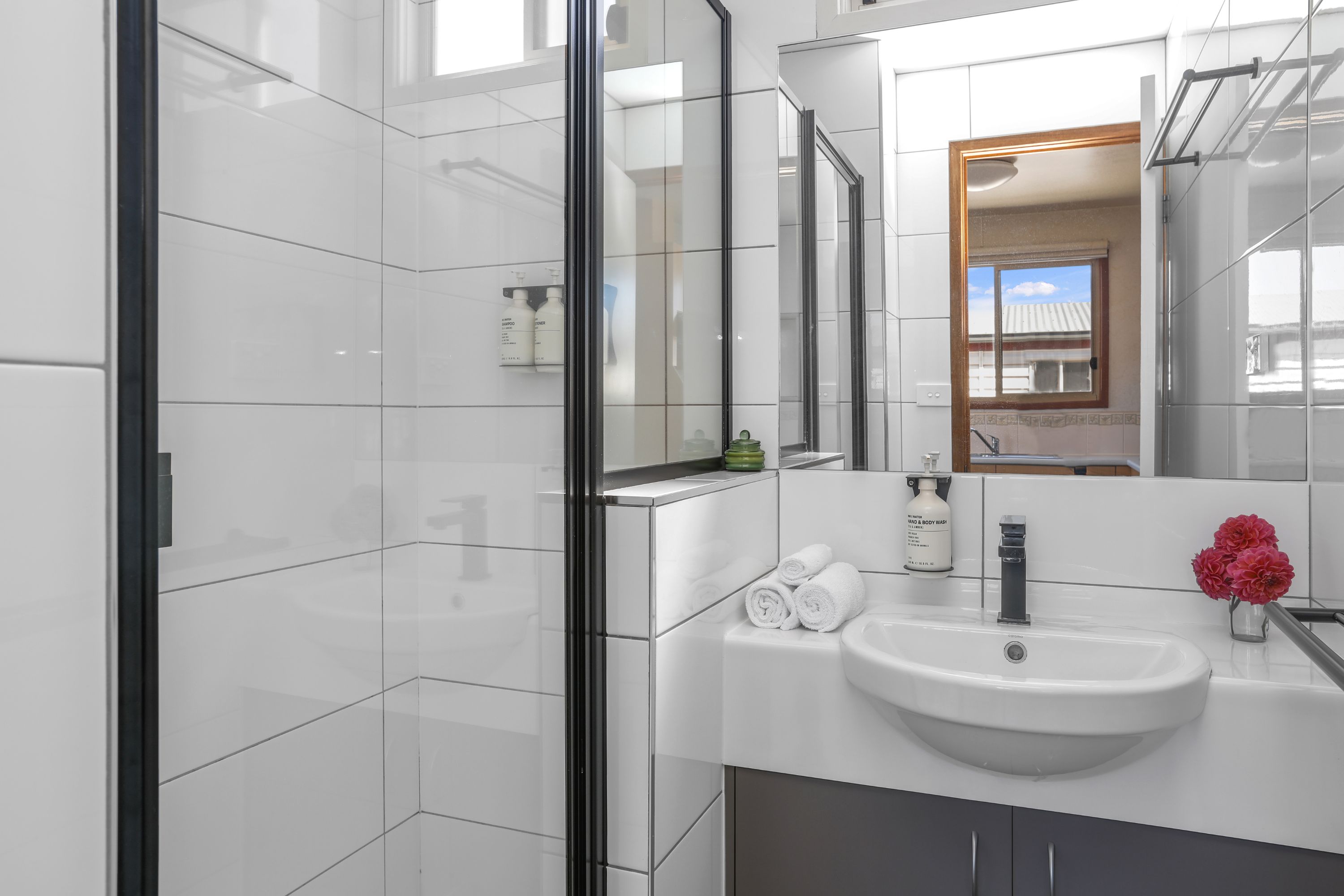 • Bathroom with shower, vanity and toilet.