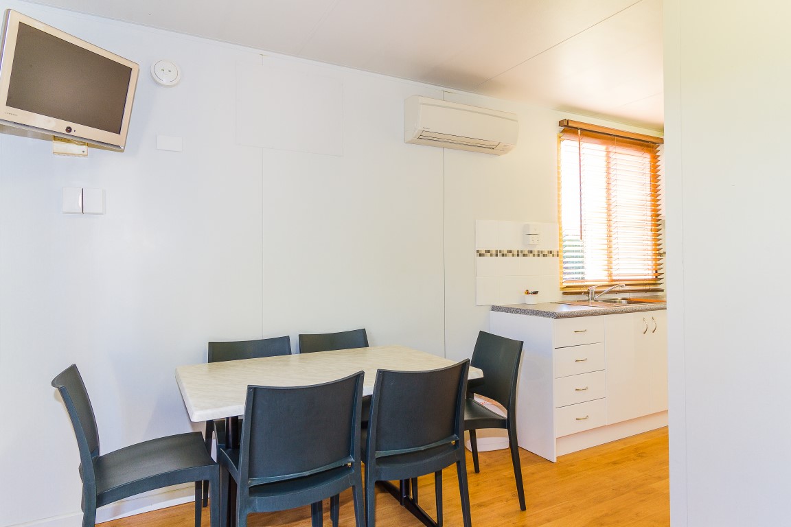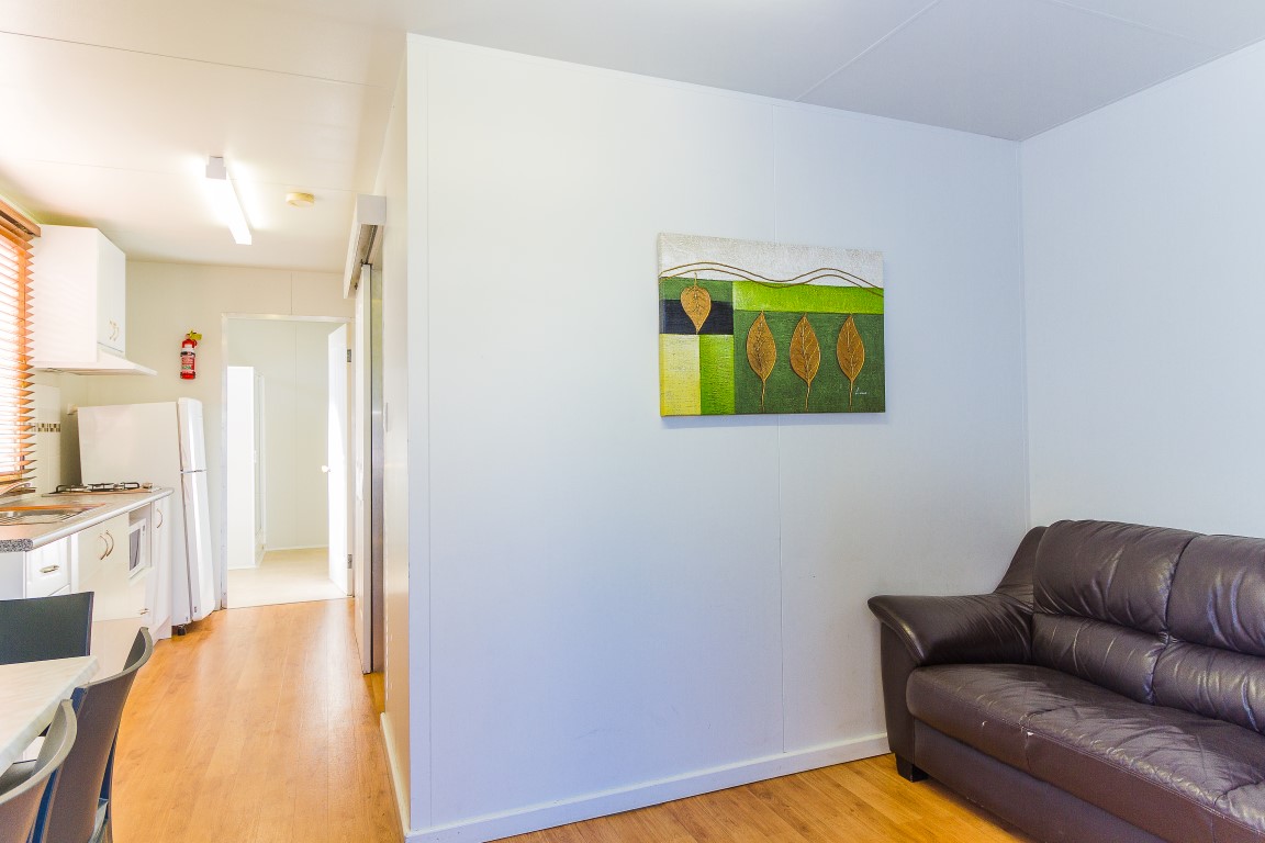 - Open plan living area with leather lounge, 28” flat screen TV/DVD, Apple TV