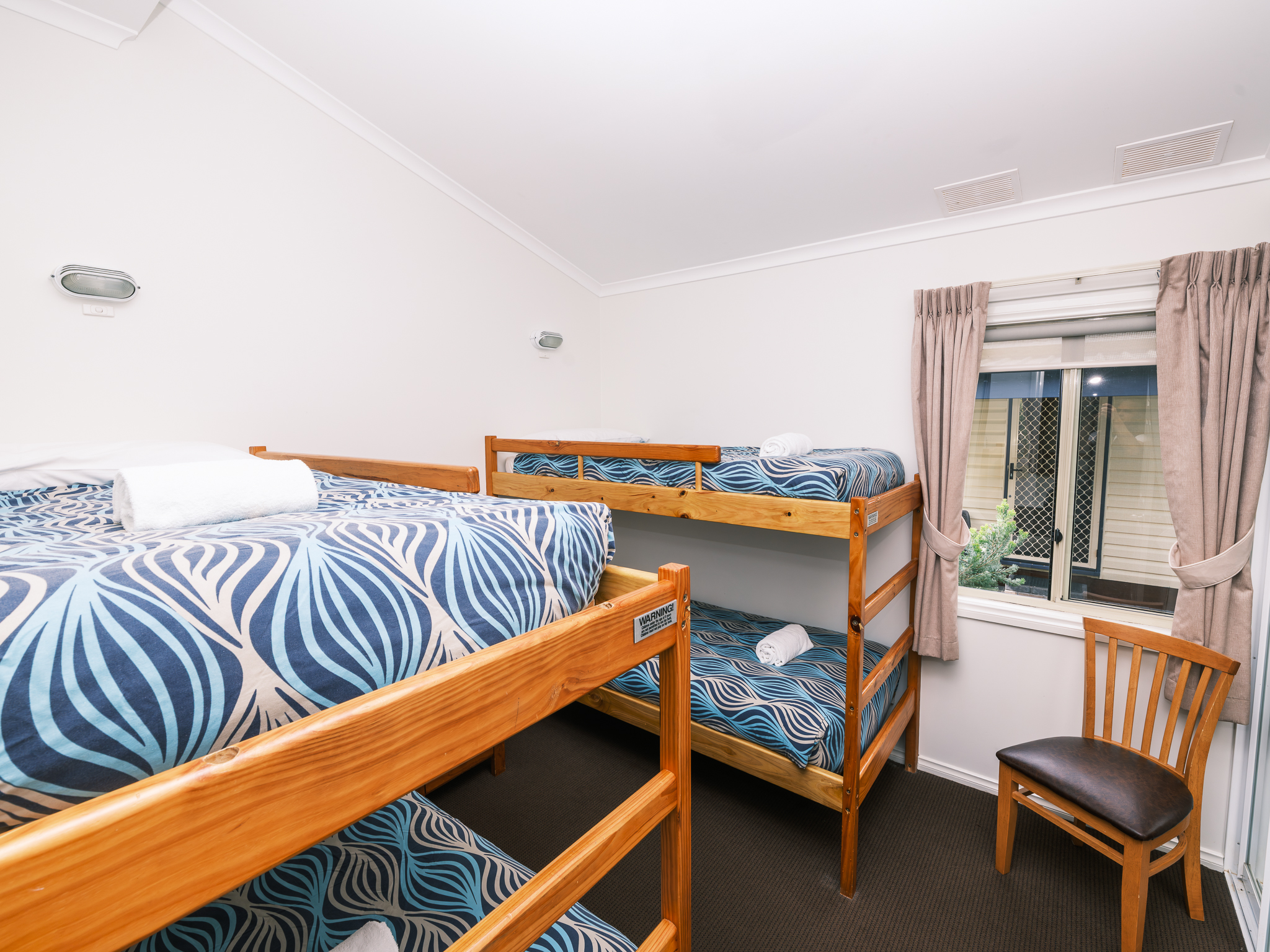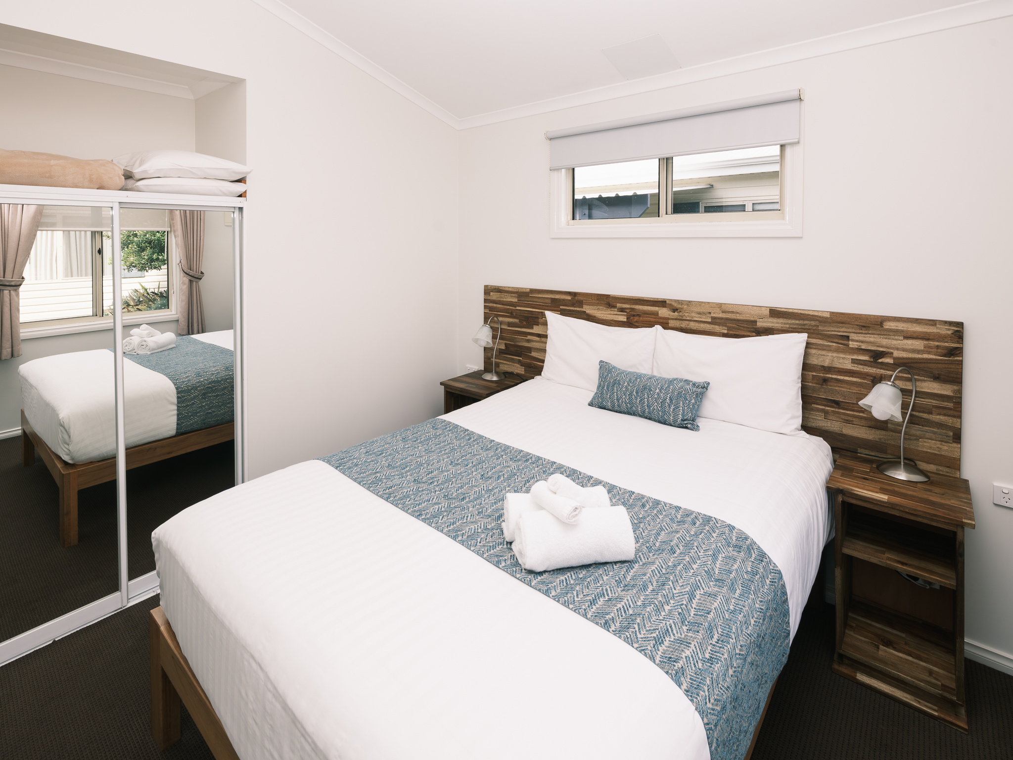This two-bedroom Spa Chalet features a queen bed in the master bedroom and two sets of bunk beds in the second bedroom.