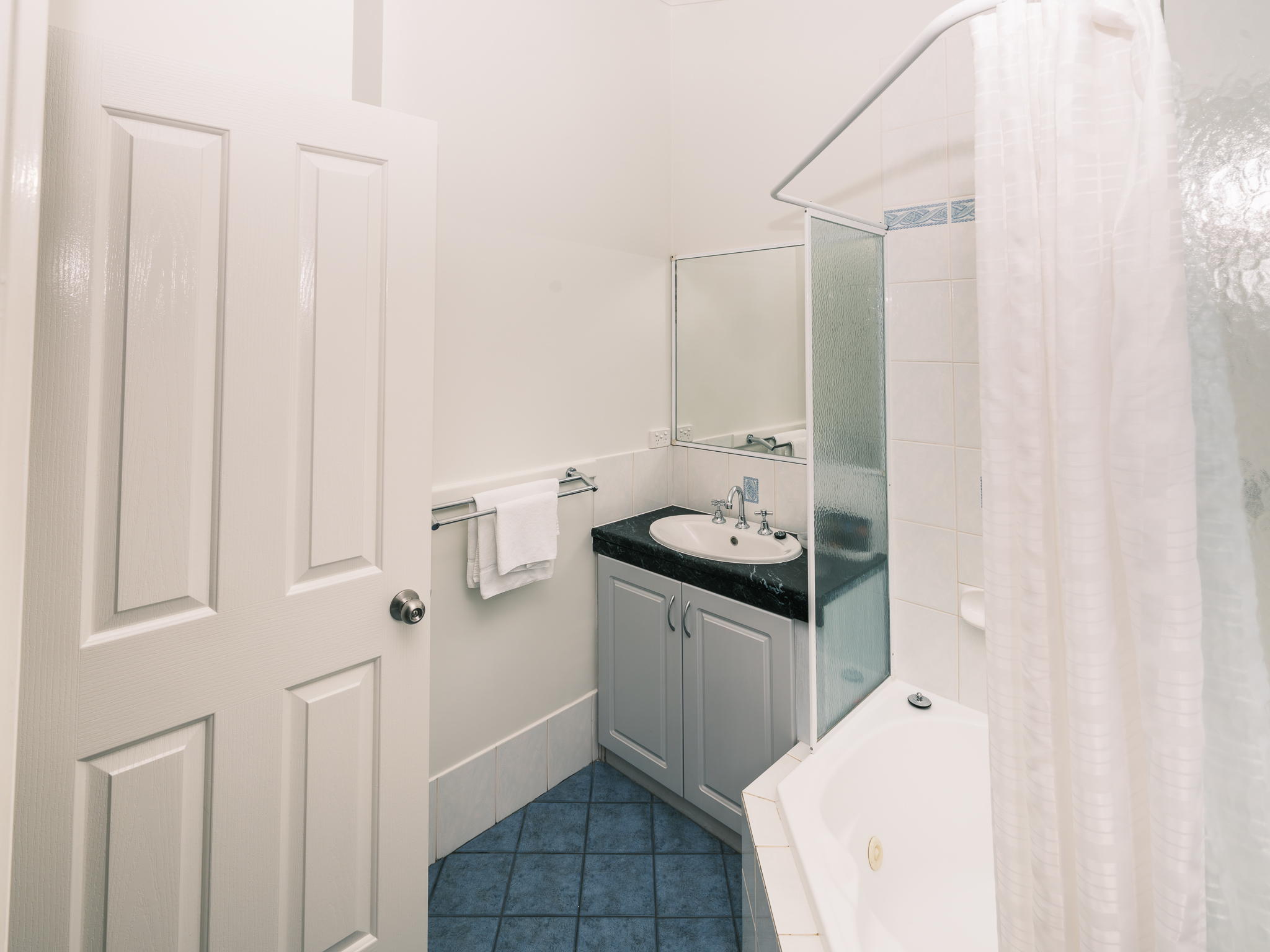 The bathroom features a spa bath with a shower overhead.