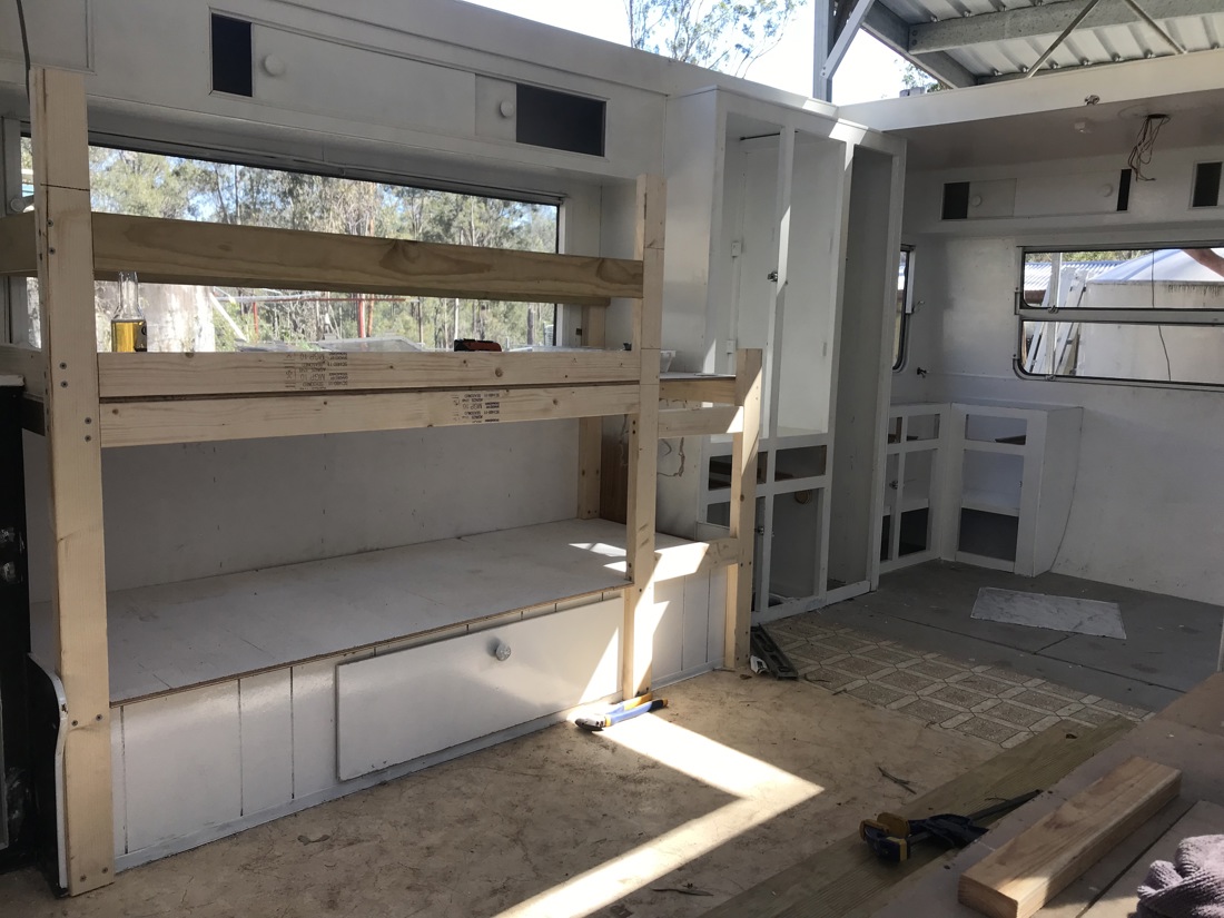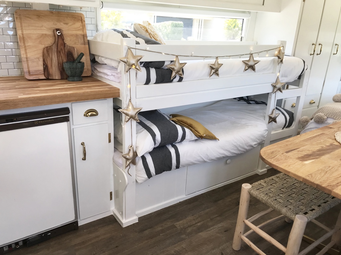 Troy has a corporate day job but is no amateur when it comes to power tools. He lovingly built the kids’ bunk beds, rebuilt the double bed converting it to a queen, and also re-built some of the cabinetry with a helping hand from his very talented father.