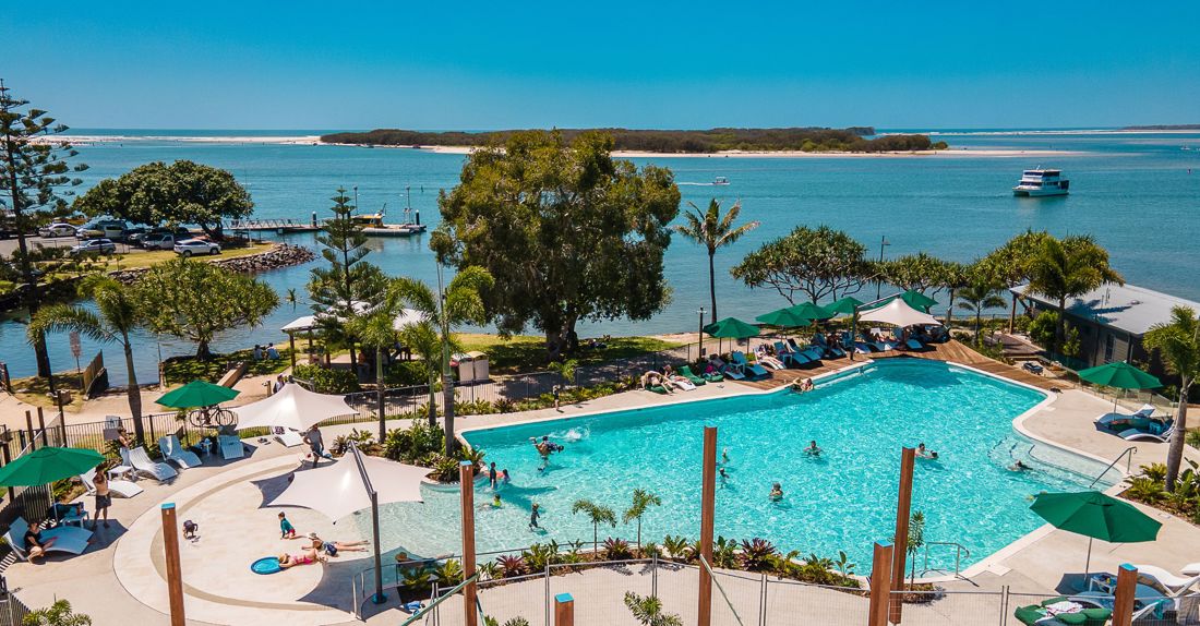 BIG4 Caloundra's new pool and entertainment area incorporates glittering views of Pumicestone Passage.